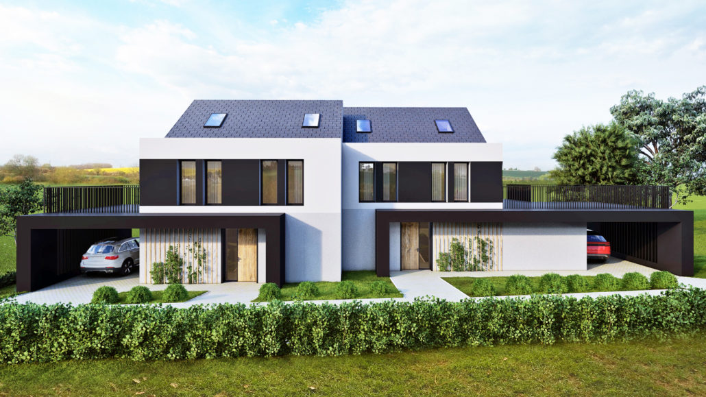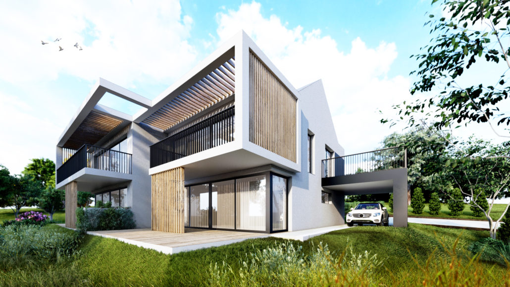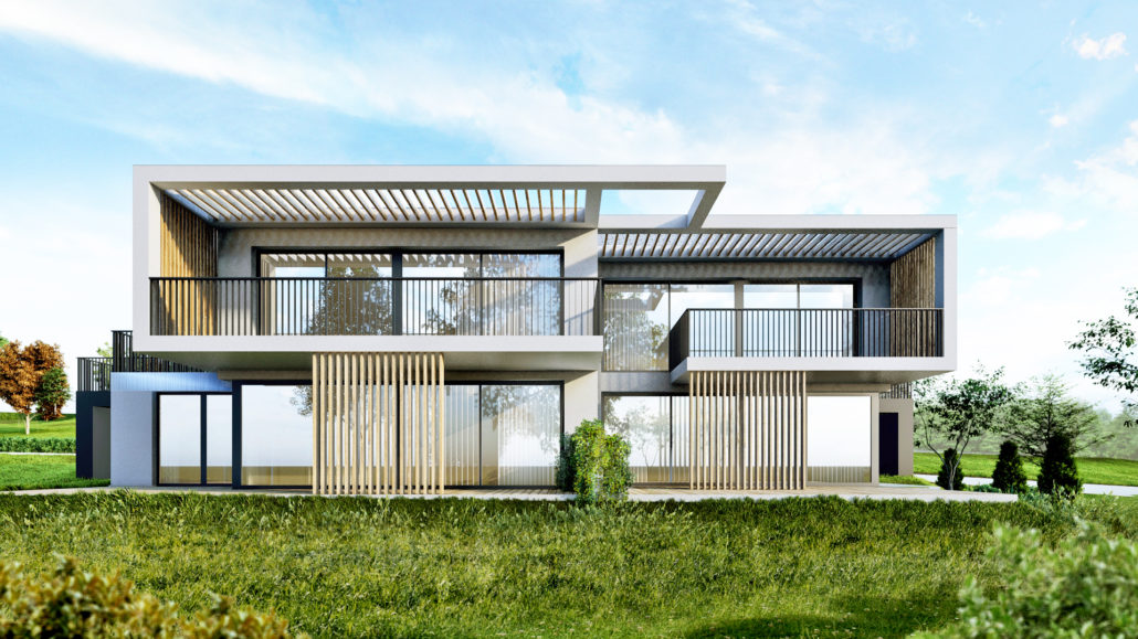 W ramach założenia zaprojektowano budynek mieszkalny jednorodzinny dwulokalowy. Zaprojektowany budynek to obiekt trzykondygnacyjny, w tym jedna kondygnacja podziemna oraz dwie nadziemne. Forma budynku składa się z prostych prostopadłościennych brył. Budynek jest przykryty dachem wielopołaciowym o nachyleniu głównych połaci równemu 37 stopni. Elewacje budynku – białe z fragmentami w kolorze szarości z drewnianymi lamelami. Na elewacji południowej budynku zaprojektowano duże przeszklenia, a na pozostałych okna o mniejszych wymiarach. Od strony północnej znajdują się główne wejścia do budynku, a nad wejściami podcień, który łączy się z tarasem na pierwszym piętrze.