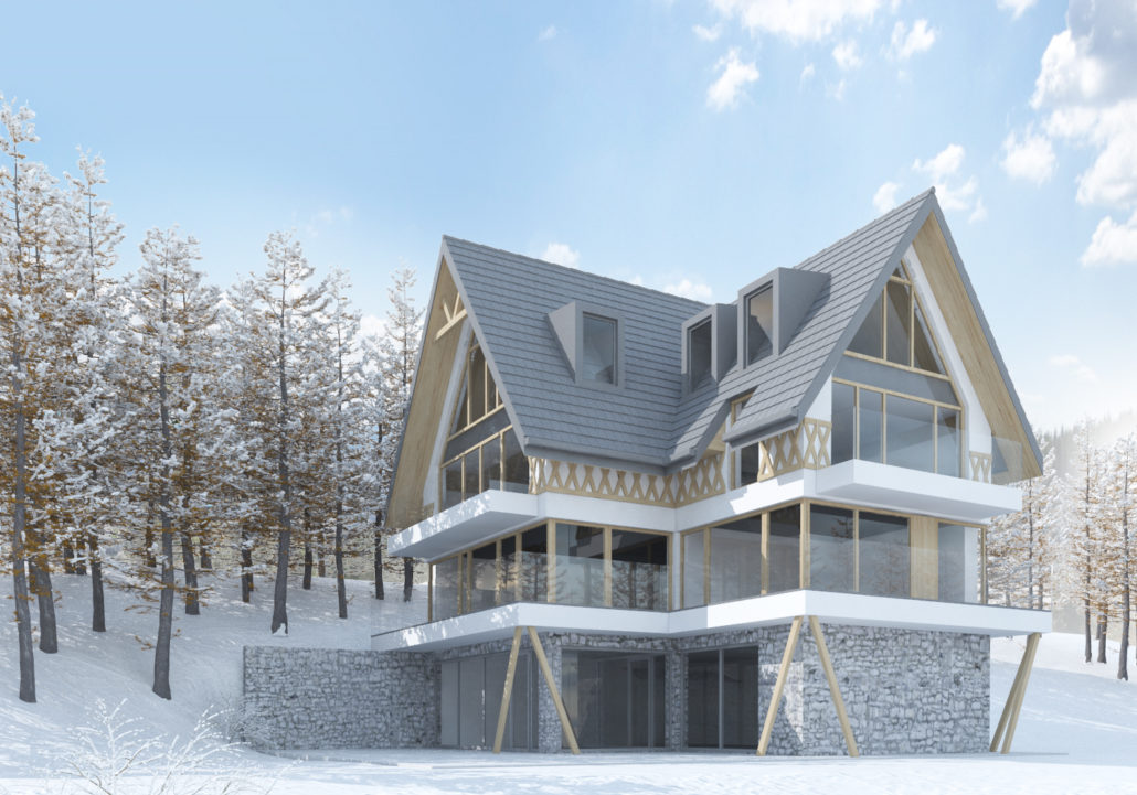 Zaprojektowano przebudowę, rozbudowę oraz nadbudowę istniejącego budynku, który miał formę tradycyjnego podhalańskiego domu jednorodzinnego. Bryła nawiązuje do starego obrysu budynku i została powiększona w taki sposób, aby jak najlepiej wykorzystać walory działki na której się znajduje. Zaprojektowano wielospadowy dach o dużym nachyleniu połaci z otwarciami w postaci lukarn oraz daleko wysunięte okapy. Budynek nawiązuje do tradycyjnego budownictwa poprzez zastosowanie na elewacjach tradycyjnych materiałów takich jak: kamień, drewno, szara dachówka. Z drugiej jednak strony w projekcie domu są także nowoczesne elementy takie jak duże przeszklenia (zwłaszcza od strony południowej oraz wschodniej). Ważnym elementem są otwarcia widokowe na Tatry. Całość stanowi harmonijny element krajobrazu, utrzymując istniejący charakter zabudowy.